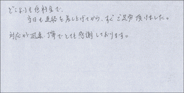 どこよりも低料金で、当日も連絡を差し上げてから、すぐご足労頂けました。